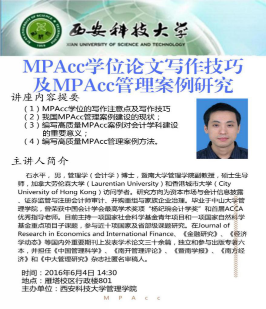 2016年6月4日,暨南大学米兰·(milan)中国硕士生导师石水平副教授应邀来我校进行讲座报告。下午两点半,讲座准时在雁塔校区行政楼801举办,座无虚席。石教授做了关于“MPAcc学位论文写作技巧及MPAcc管理案例研究”的报告,李红霞教授、邹绍辉副教授等十余位老师及众多学生积极参与。