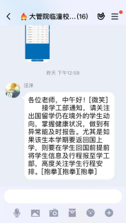 新冠肺炎的肆虐让人们在空间上保持了距离,却让我们在心灵上更加贴近。疫情发生以来,辅导员每日问候必达,为的是收到学生的一句“身体健康”。在抗疫阻击战中,院领导以及辅导员心系学生,坚守岗位,奋勇向前,以饱满的姿态积极投入到疫情防控工作中,用实际行动践行着自己的初心使命。