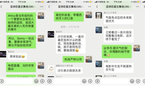 担心多数学生英文水平可能看字幕依然未必能完全跟上剧情,于立新老师同时在微信群随时将比较难以理解的段落、有关情节的社会背景、语言上比较有特色的地方跟同学们交流,从同学们的反映看,达到了较好的教学效果。