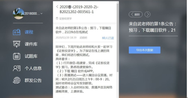 为了学生让提前熟悉网课这种新的教学模式,在正式开学前一天,刘旸老师首先通过雨课堂微信公众号向信管17和电商17的学生们推送了《网络营销》和《电子支付与风险管理》两门课程的语音课件—网络课程说明会,向学生介绍教学计划与设计,并对要求学生提前做好上网课的软硬件准备。
