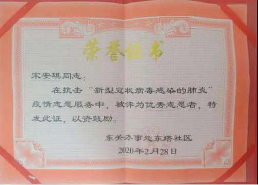她还协助社区工作人员进行外来返汉人员的隔离工作,并进行外来人员的排查走访、疫情防护知识的宣传等工作。在志愿服务期间,共计登记进出人数2560人,排查走访678户,约4000人,并被社区评为“优秀志愿者”。