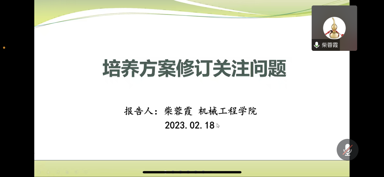 2月15日,学校组织校内外专家对我院七个专业2022版培养方案进行了审查,专家们从培养目标表述的准确性、毕业要求指标点分解的合理性、课程体系设置的完备性、课程与培养目标关联矩阵的逻辑性以及核心课程设置的科学性等方面内容进行质询,并提出很多宝贵的建设性意见和建议。我院就此邀请到机械学院柴蓉霞老师于2月18日晚7点半通过腾讯会议对全体教师进行辅导。