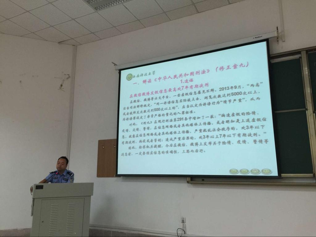 9月10日上午,为增强2016级新生的校纪校规和安全意识,促进平安校园建设,提升大学生关于国家安全及和谐稳定的认识,我院在9号教学楼105和101教室举行“校纪校规与大学生安全”为主题的宣讲,特邀我校保卫处沈宗华、周涛老师担任主讲。