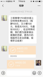 一个党员就是一面旗帜,一个支部就是一个堡垒。在全国人民“众志成城、抗击疫情”之际,我支部党员不忘初心、牢记使命,心系抗疫一线,自发缴纳“特殊党费”5200元。一滴水可以折射出太阳的光辉,萤火虽小,但点滴汇聚,终成熠熠星河,我们坚信在党中央的正确领导下,在广大党员干部和人民群众的齐心协力之下,必将打赢这场疫情防控的保卫战!