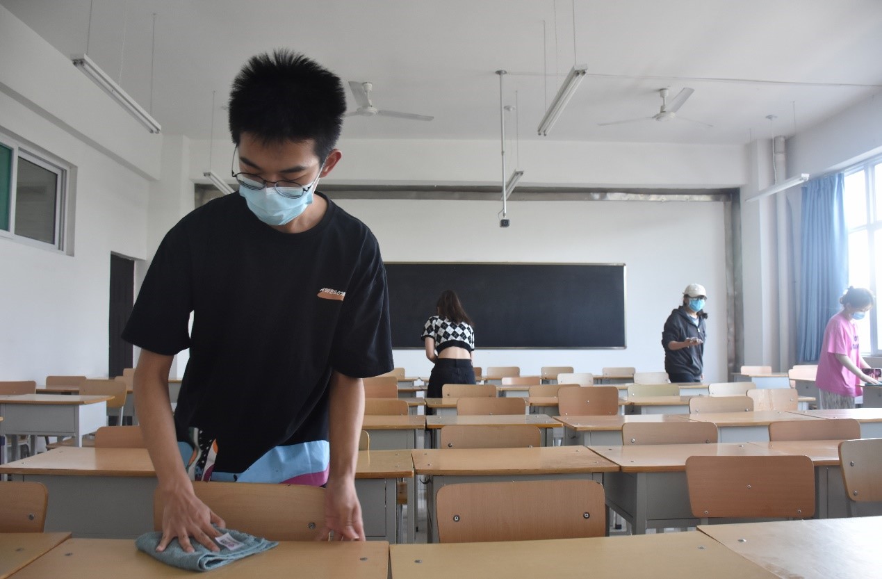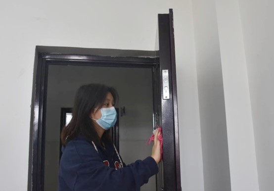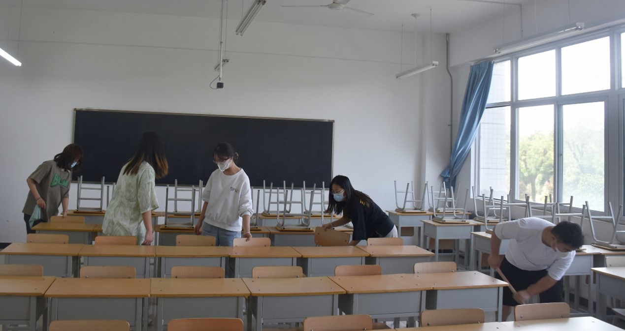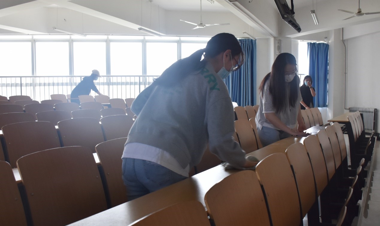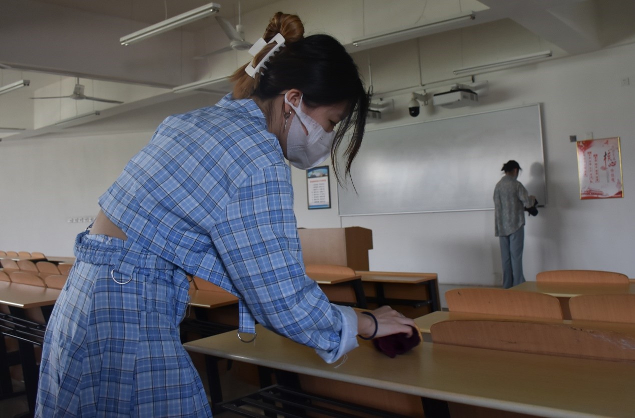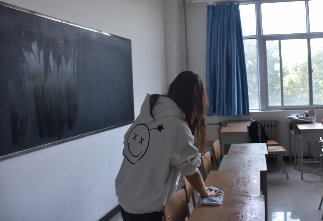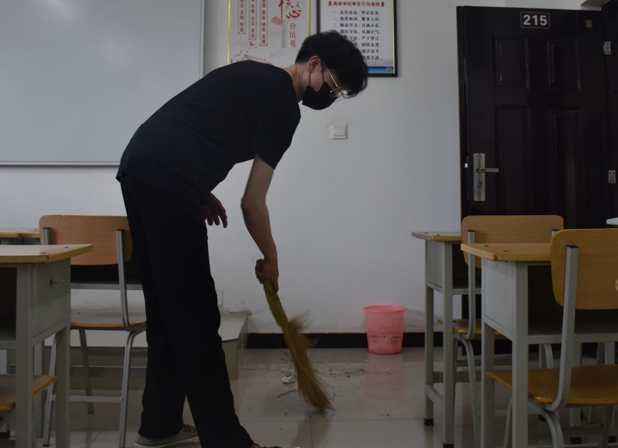 本次活动内容是对划分的公共区域进行卫生清洁,包括一号教学楼二楼走廊、阶梯教室、楼梯,同学们对区域内的垃圾进行了清理并消毒。