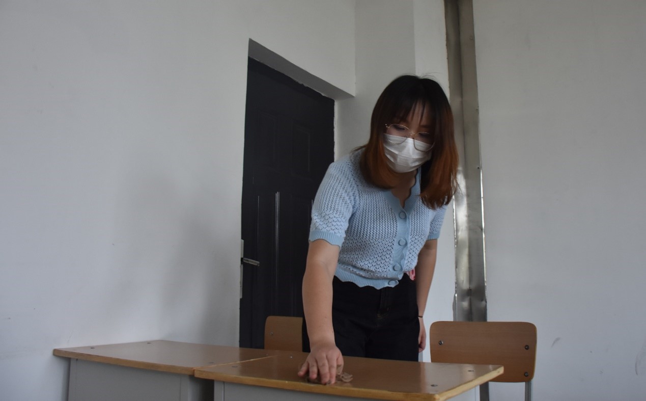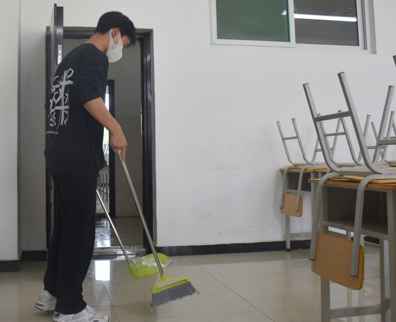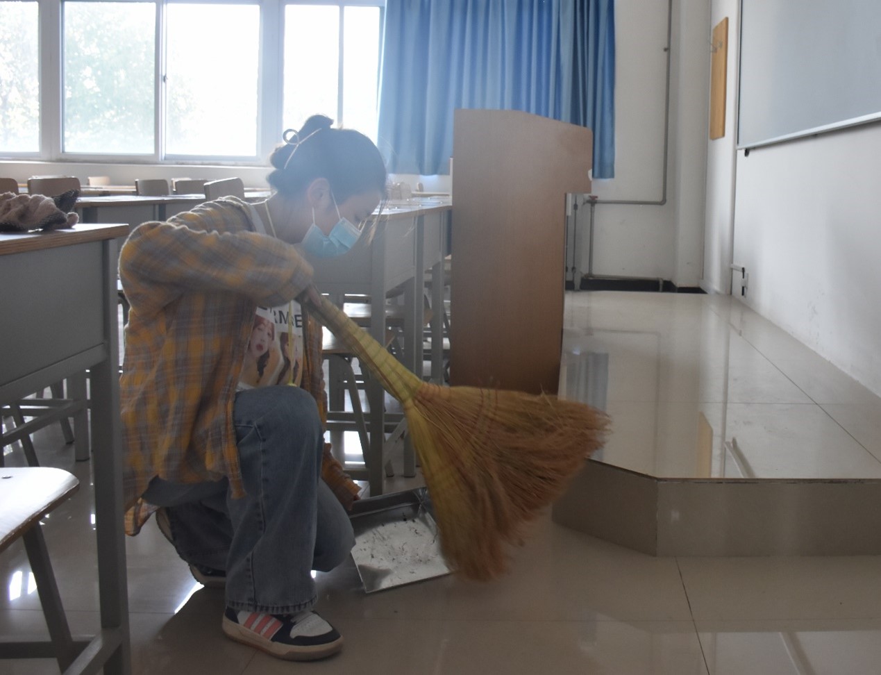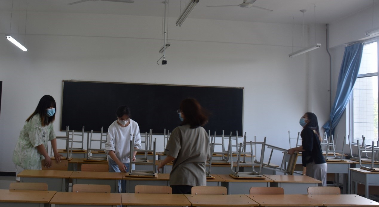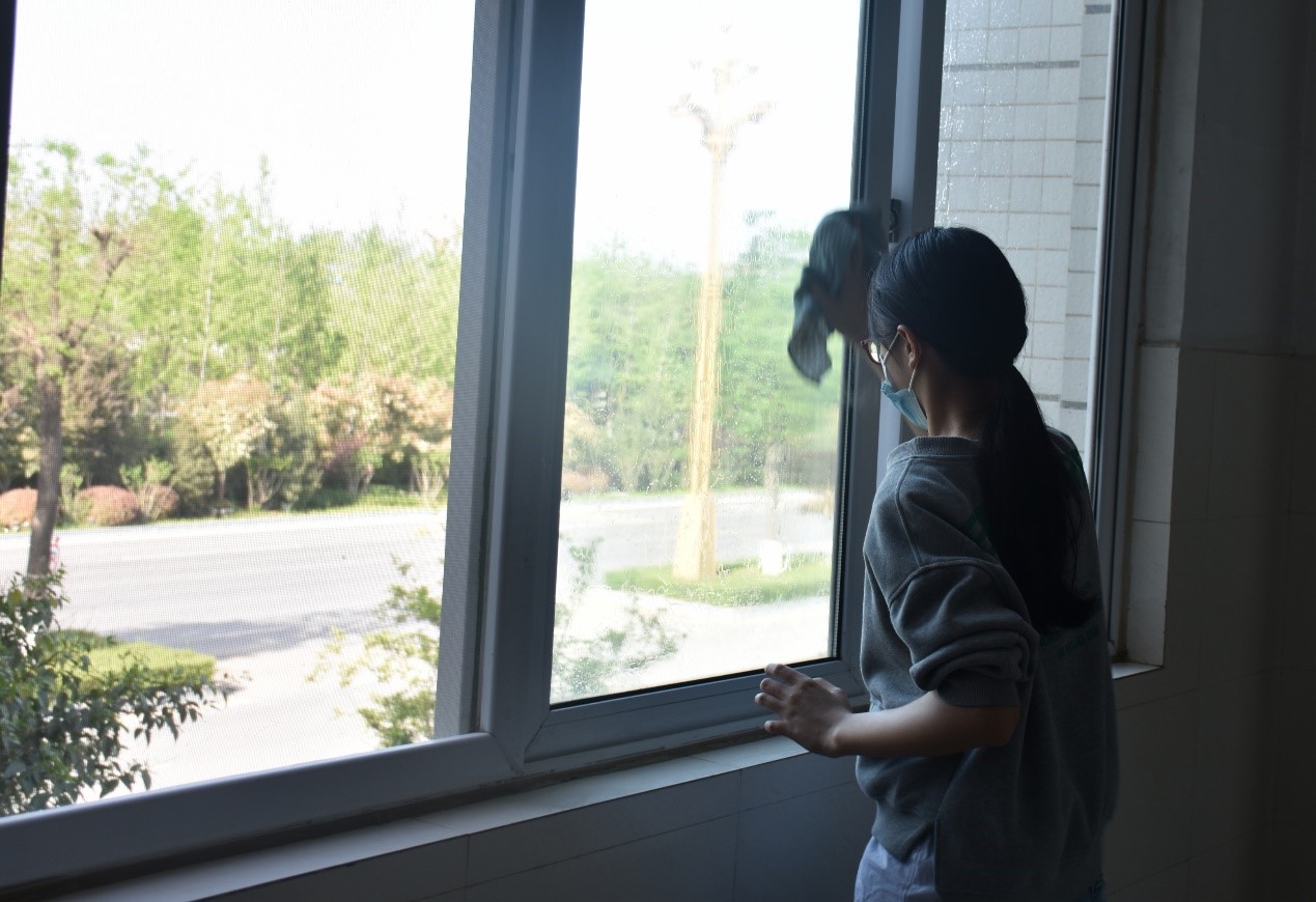 本次活动内容是对划分的公共区域进行卫生清洁,包括一号教学楼二楼走廊、阶梯教室、楼梯,同学们对区域内的垃圾进行了清理并消毒。