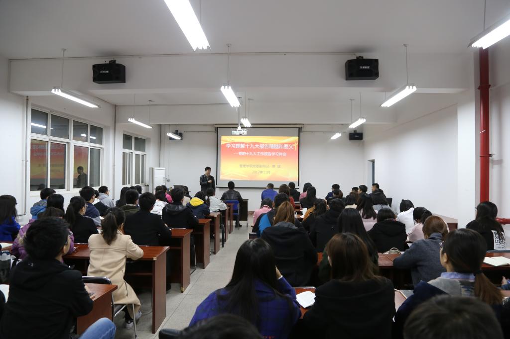 贾斌指出,党的十九大是一次具有划时代、里程碑意义的历史性会议,最重要的成果是将习近平新时代中国特色社会主义思想写入党章。我们要把学习贯彻落实党的十九大精神作为当前和今后一个时期的首要政治任务。要通过十九大精神专题党课的宣讲、党员再教育行动方案的推进实施,将十九大精神全方位融入到学院的思想政治教育工作中。