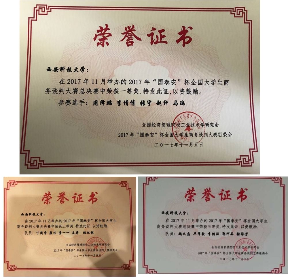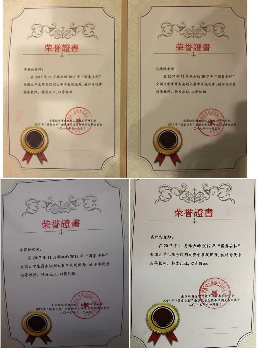 经过赛前老师的悉心指导和统筹安排以及各位参赛选手的充分准备,我院代表队伍在比赛中力挫强敌,不负众望,取得了优异的成绩。其中,李朋林老师、吕靖烨老师、窦红宾老师和朱黎佳老师被评为“优秀指导老师”,本科生代表队周泽鹏、李倩倩、张宇、赵轩、马瑞队荣获一等奖;魏久磊、毕则乾、李懿涵、郭珂茹、张雅芳队荣获三等奖;研究生代表队丁周香、康佳、董一一、王婷、姚佳棋荣获三等奖;周泽鹏荣获“优秀谈判手”称号。