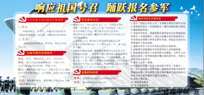 报名时间:2019年1月10日—2019年5月25日(注:在校大学生放暑假前,应届毕业生离校前完成预定兵),5月25日-8月5日报名的学生随同高校新生参加体检、政审。