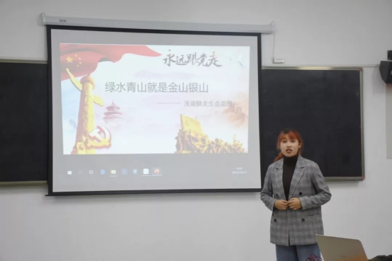2018级本科生党支部入党积极分子毛千菀陕北生态治理这个改革开放以来备受关注的问题以及习近平总书记提出的“绿水青山就是金山银山”这一理念。号召青年党员要大力弘扬人与自然协调发展的理念,始终坚持环境保护意识和可持续发展的战略方针,继续朝着中华民族伟大复兴的中国梦奋勇前进,不断坚持和发展中国特色社会主义。