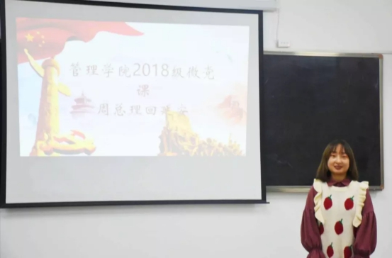 2018级本科生党支部入党积极分子张改琪为大家讲述了周总理与延安的历史渊源。人民是中国共产党的坚实后盾,党员是人民的先锋。回顾历史,直视现在,来自于人民的青年学生党员要学会为人民服务、坚定个人理想信念、用知识武装自己,为实现中华民族伟大复兴贡献力量。