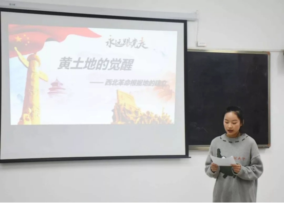 2018级本科生党支部入党积极分子赵文萱以“黄土地的觉醒”为主题讲述了西北革命根据地的组成、功绩以及后世影响。西北革命根据地的建立,为红军胜利会师提供了可靠条件,作为红军的落脚点,它推动了工农红军的胜利和国内形势的迅速发展。她号召当代青年要向先辈学习,坚持从实际出发,支持正确的方针和政策,矢志不渝地做中国特色社会主义事业的建设者、捍卫者。