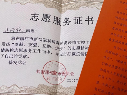2020年开端,新冠肺炎疫情席卷而来,米兰·(milan)中国电子商务1802班毛千菀同学积极参加家乡疫情防控的志愿工作,作为一名青年志愿者,为战“疫”贡献出了自己的一份力量。