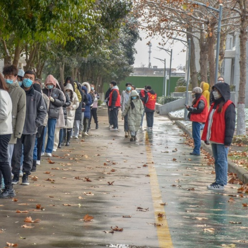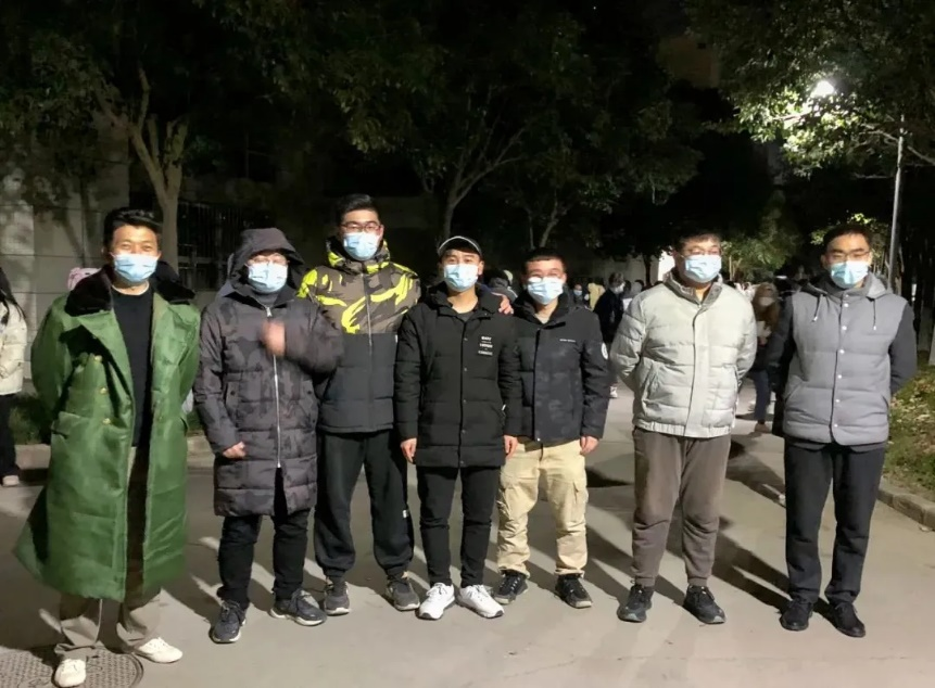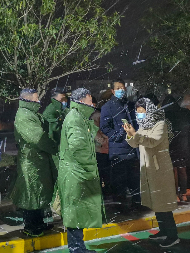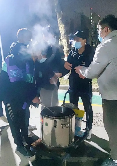 在寒冷的冬夜里,老师陪伴在同学们两侧,时刻关注着核酸队列,并提醒同学们前方有姜汤领取处。