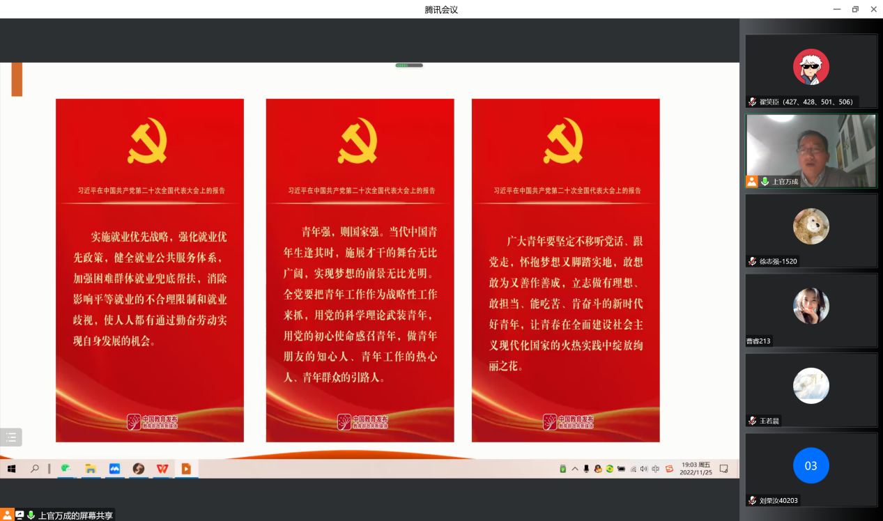 上官万成带领支部党员学习了党的二十大报告的主要内容,强调广大学生党员要认真学习党的二十大精神,把其中的深刻理论付诸实践,要在疫情防控和就业工作中主动担当作为,贡献力量。他要求近期要做好以下几点:第一,思想上高度重视;第二,负起责任组织好核酸检测;第三,做好宿舍卫生、通风、消毒;第四,维护宿舍良好人际关系,主动发现化解矛盾;第五,不信谣,不传谣,增强抗疫信心。