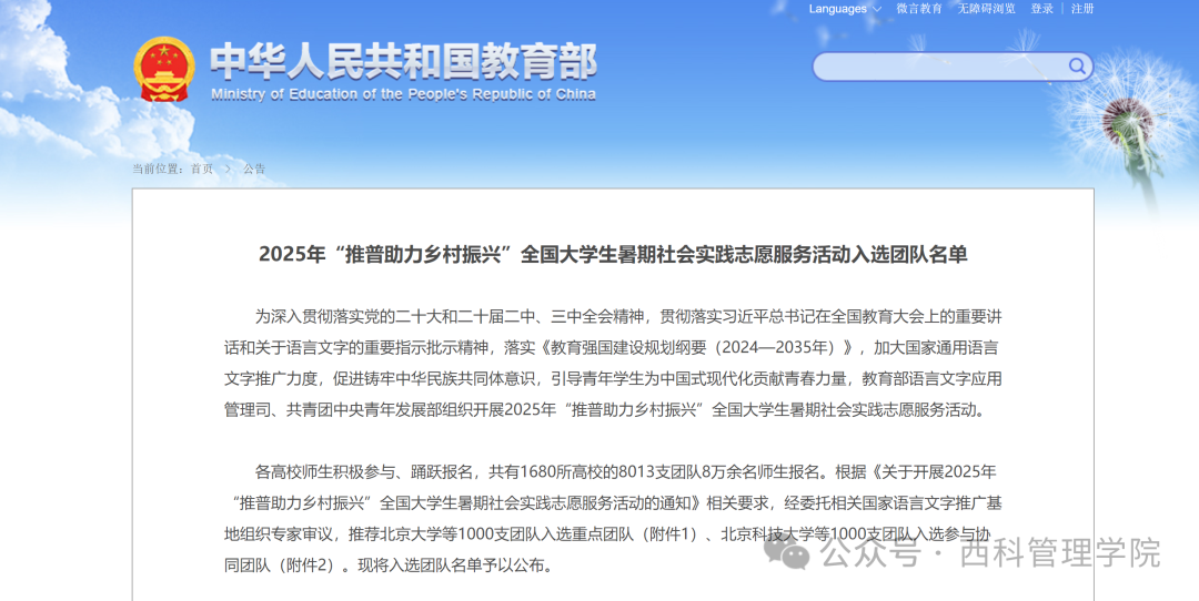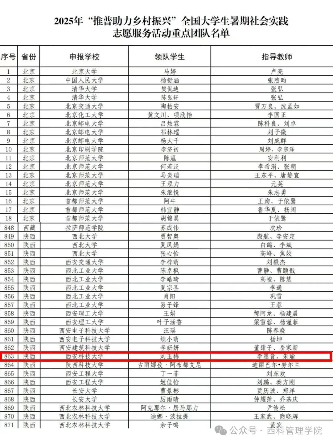 近日,教育部网站公布2025年“推普助力乡村振兴”全国大学生暑期社会实践志愿服务活动入选团队名单。在全国1680所高校8013支团队的激烈竞争中,仅有1000支重点团队和1000支参与协同团队脱颖而出。米兰·(milan)中国“西科推普进秦巴,语通安康润万家”社会实践队凭借扎实的前期筹备与创新实践方案,成功跻身全国重点团队行列。