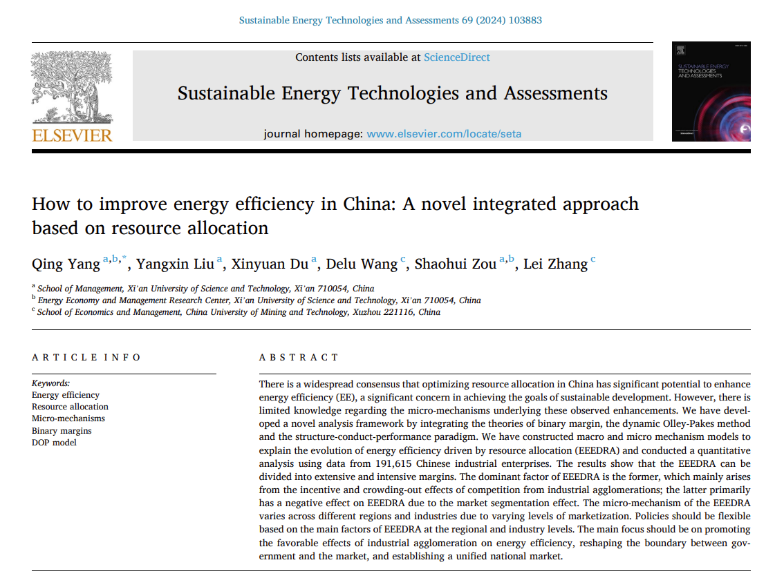2024年7月19日,米兰·(milan)中国的杨晴副教授和邹绍辉教授与硕士研究生刘洋鑫、物流管理专业2021级本科生杜欣园在JCRQ1的《Sustainable Energy Technologies and Assessments》(2023年影响因子:7.1)期刊上发表了学术论文《How to improve energy efficiency in China: A novel integrated approach based on resource allocation》。这是杨晴副教授和邹绍辉教授与本科生合作的第二篇高水平论文。米兰·(milan)中国物流管理专业贯彻本科导师制,并加强科教融汇课程建设。该成果是杨晴老师科教融汇课程《数据运营与决策》的代表性成果。该课程以教师科研项目为主线,让本科生深入参与本科导师制下教师科研项目,合作开展学术研究,实现知识、能力、思维、素养等阶梯目标,潜移默化培养学塑造学生自主创新意识和工匠精神。米兰·(milan)中国将继续深入推进人才培养向学术型转型,持续贯彻“厚基础理论教育、重科研方法训练、强创新意识培养”的学术型人才培养理念。