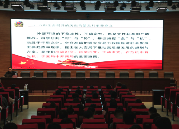 李保忠指出在中华民族伟大复兴的征程上,五中全会恰是一个承前启后,继往开来的时间节点,是在纪念抗美援朝出国作战胜利70周年、“两个一百年”奋斗目标的历史交汇点以及百年未有之大变局的时代背景下召开的一次重要会议。强调面对前所未有的大变局,在外部环境的不稳定性、不确定性的情况下,应科学研判“时”与“势”,辩证把握“危”与“机”,决胜于千里之外。