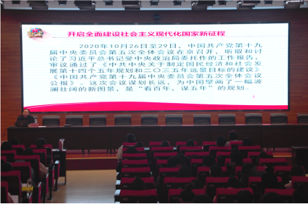 李保忠教授在报告会上以胜利实现第一个百年奋斗目标之后我们应如何带领14亿中国人民开启全面建设社会主义现代化国家新征程的问题展开,要求建设者们应谋划全局、精心组织;在关键时刻应精准指点;面对问题发扬民主,集中全党智慧进行解决。其次李保忠列举了“十四五”规划《建议》的新亮点,从成果、论断、目标、格局、部署五方面进行阐明,为我国未来五年建设提出了新的方法,勾画了新的蓝图。