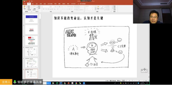 邹老师利用《教父》里的“花半秒钟看清事物本质的人,和花一辈子都看不清事物本质的人注定是截然不同的命运”,警醒同学们认知的重要性。知识不能改变命运,认知才有可能。并以当前疫情为例,浙江地区在面对疫情能快速作出反应,成为全国抗击疫情的率先垂范,而内部地区慢反应慢作为的表现,这些就是认知能力高低导致的差距。