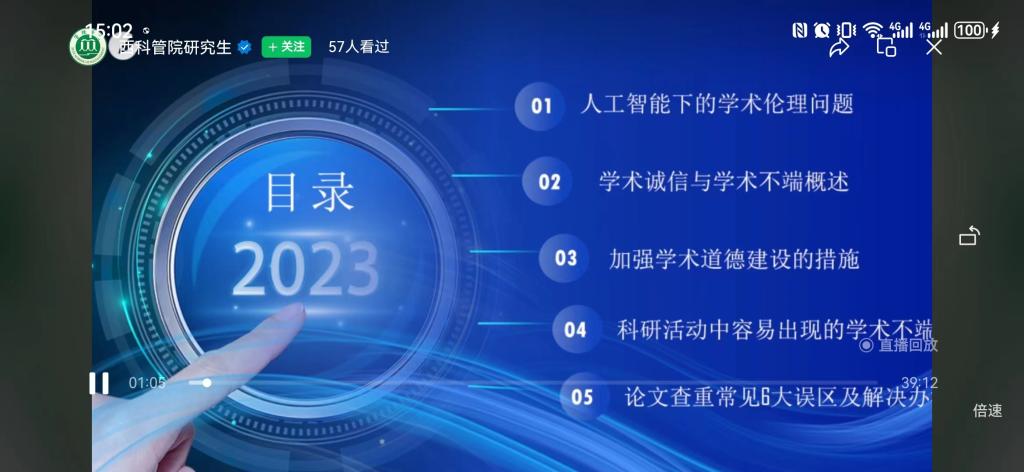 另一场报告是由王晓文老师主讲的《学术规范与学术道德》,主要从人工智能下的学术伦理问题;学术诚信与学术不端概述;加强学术道德建设的措施;科研活动中容易出现的学术不端;论文查重常见6大误区及解决办法五个方面进行详解。王晓文老师首先以学术不端事件案例为切入点,分析学术不端事件的背景、原因和影响,帮助同学们更直观地理解学术规范和学术道德的重要性。其次,王老师根据学术不端行为的定义及表现,为同学们列举了学术不端行为的种类,如抄袭、篡改数据、盗用他人成果等并指出这种行为对学术界和个人的危害性。最后,针对科研活动中容易出现的学术不端现象王老师指出:避免学术不端需要建立全面的学术规范意识,加强对学术道德的培养和教育,建立健全的学术管理和监督机制,同时也需要科研人员本身保持良好的职业操守和道德品质。本场讲座有助于同学们在学术研究和职业生涯中建立正确的学术观念、培养专业素养,提高对学术不端行为的识别和处理能力。