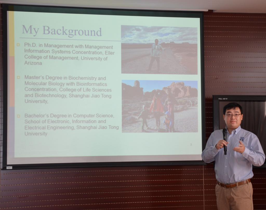 张宇镭系美国北亚利桑那大学弗兰克商学院(AACSB认证)弗兰克教授,终身教授。张教授结合自身过硬的专业知识并结合当前大数据在日常生活中的实际应用情况,从数据挖掘、文本挖掘、互联网信息挖掘、大数据处理、人机交互、计算机信息系统采用以及信息系统教育等方面进行了详细的分析介绍。张教授全程英文作报告,其流利标准的口语也令同学们赞不绝口,不时传出阵阵热烈的掌声。