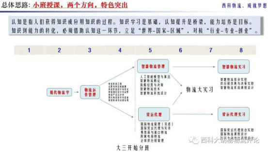 本专业涵盖智慧物流、货运代理两大方向。本专业学生将系统学习经济学、管理学、礼仪与沟通、思维与写作、现代物流学、物流管理系统分析、运营与供应链管理、物流系统工程、物流系统设计与优化、物流模型、算法与仿真、国际货运代理、港口物流、智慧物流、应急物流学、能源物流等方面的基本理论与方法,稳步提升商业认知、宏观视野、领导格局和人文素养,协同推进“知识-认知-能力”一体化循环发展,系统培养“基础素养、基础能力、高效学习、专业技能、专业工具、专业思维和创新创业”能力体系,最终成为“立足物流、站位管理、引领商业”的应用型高级复合型专门人才。